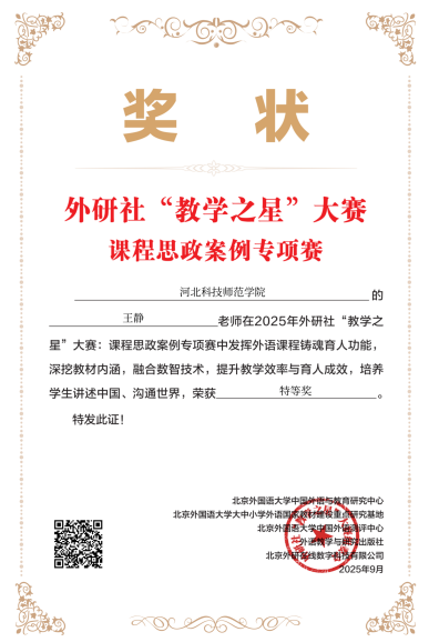 日前,2025年外研社“教学之星”大赛:课程思政案例专项赛评选结果揭晓,我院365英国上市公司在线教师王静凭借彰显独特教学智慧的创新设计,在全国各高校教师同台竞技的激烈角逐中荣膺全国特等奖,这是河北省唯一获得特等奖的教师,为学校赢得了荣誉。